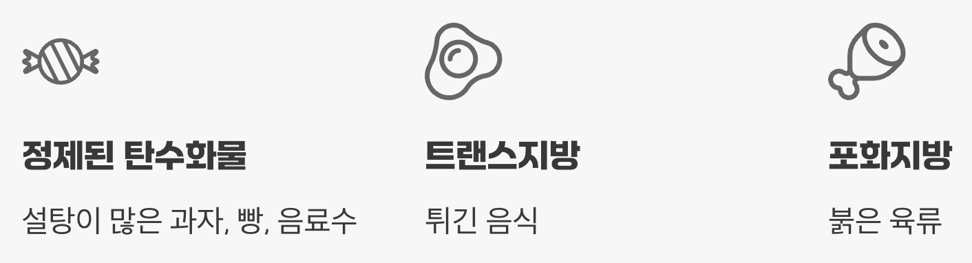 우리 몸의 염증 반응을 가속화하는 대표적인 음식들이 있습니다. 아무리 좋은 음식을 챙겨 먹어도, 염증을 일으키는 음식을 계속 섭취한다면 밑 빠진 독에 물 붓기나 다름없습니다. 통증을 줄이기 위한 첫 번째 단계는 바로 이 ‘나쁜 음식’들을 식탁에서 덜어내는 것입니다.