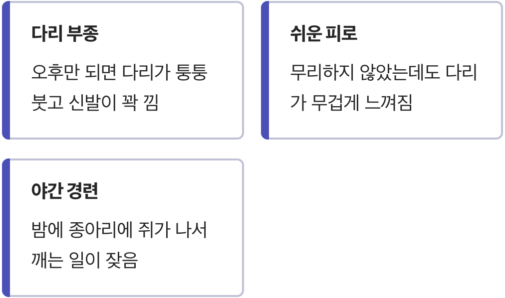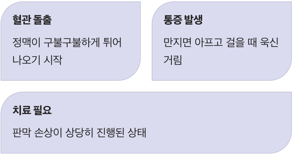 하지 무거움, 혈관 돌출, 부종 등이 단계별로 나타납니다. - 하지 정맥류(Varicose veins) | 질환백과 - 서울아산병원