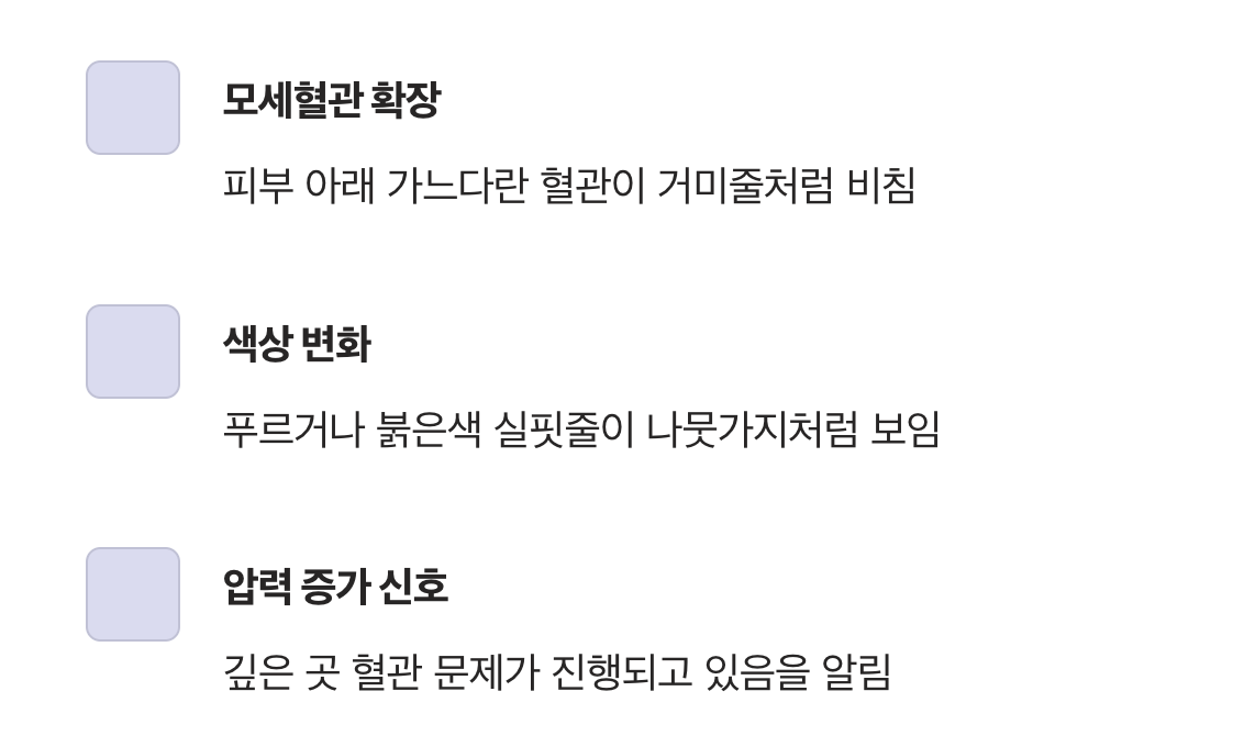 이제 눈에 보이는 변화가 나타나기 시작합니다. 피부 바로 아래에 있는 가느다란 모세혈관들이 늘어나, 마치 거미줄이나 나뭇가지처럼 푸르거나 붉은색의 실핏줄이 비쳐 보이는 단계입니다. 이를 ‘모세혈관 확장증’ 또는 ‘망상정맥’이라고 부릅니다.