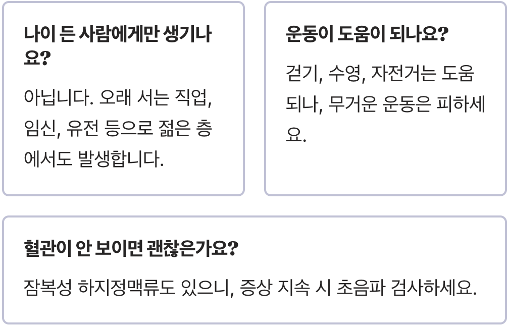 A. 아닙니다. 물론 노화가 중요한 원인 중 하나이지만, 오래 서 있거나 앉아있는 직업(교사, 간호사, 사무직 등), 임신과 출산, 유전적인 요인 등으로 인해 20~30대 젊은 층에서도 충분히 발생할 수 있습니다.