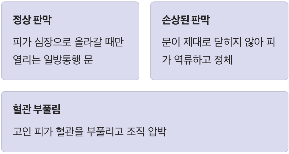하지만 이 문이 여러 가지 이유로 망가지거나 약해지면, 문이 제대로 닫히지 않아 피가 아래로 역류하고 정체되는 현상이 발생합니다. 이렇게 다리 아래쪽에 고인 피는 혈관을 부풀리고 주변 조직을 압박하면서, 우리가 겪게 되는 다양한 불편함의 시작점이 됩니다.