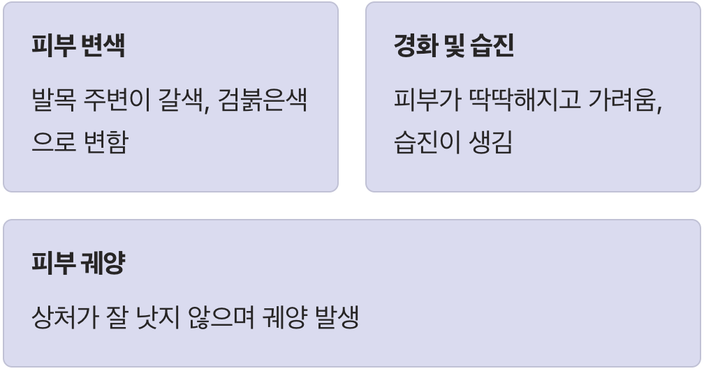여기서 더 진행되면 피부가 딱딱하게 굳고, 작은 상처에도 잘 낫지 않으며 결국 피부가 헐어버리는 ‘피부 궤양’으로까지 이어질 수 있습니다. 이 단계에 이르면 치료가 매우 복잡하고 어려워집니다. 따라서 이러한 심각한 합병증이 생기기 전, 초기 단계에서 적극적으로 관리하고 치료하는 것이야말로 건강한 다리를 평생 지키는 가장 현명한 방법입니다.