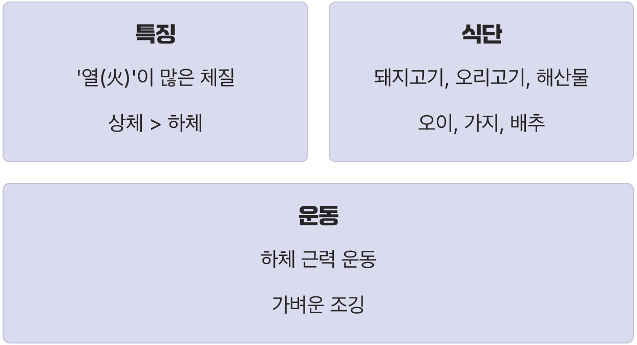 열정적이고 성격이 급한 소양인은 '열(火)'이 많은 체질입니다. 상체에 비해 하체가 약하고, 소화 기능은 좋지만 스트레스를 받으면 폭식으로 이어지기 쉬운 경향이 있습니다. 몸에 열이 많아 시원한 음식이나 자극적인 음식을 즐기다가 위장 기능이 나빠지기도 합니다.