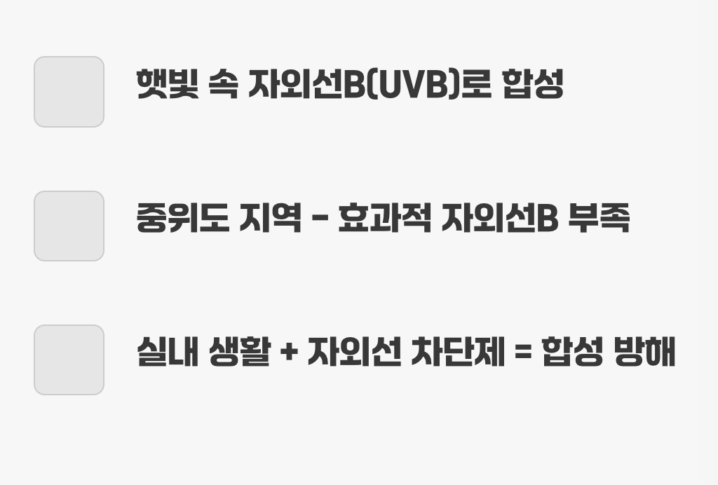 우리나라가 위치한 중위도 지역은, 비타민D 합성에 효과적인 자외선B의 양이 절대적으로 부족한 계절이 1년의 절반 이상을 차지합니다. 또한, 대부분의 시간을 실내에서 보내는 생활 습관과 자외선 차단제를 꼼꼼히 바르는 문화 역시 피부의 비타민D 합성을 거의 불가능하게 만듭니다. 결국, 햇빛만 믿고 있다가는 나도 모르는 사이에 심각한 결핍 상태에 놓이게 되는 것입니다.