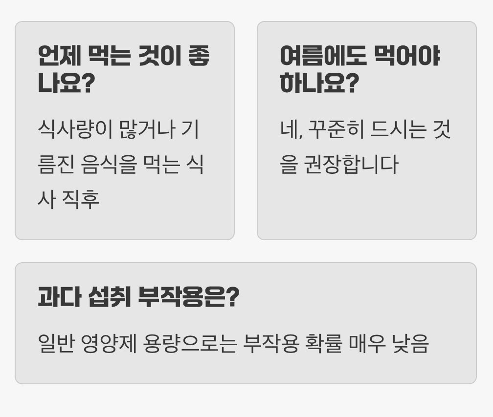 A. 지용성 비타민이므로 음식물 속 지방과 함께 섭취할 때 흡수가 가장 잘 됩니다. 따라서 아침, 점심, 저녁 중 가장 식사량이 많거나 기름진 음식을 먹는 식사 직후에 드시는 것을 추천합니다.