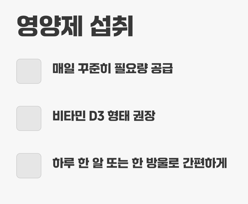 햇빛도, 음식도 충분하지 않다면 우리에게 남은 가장 현실적이고 효과적인 해결책은 무엇일까요? 바로 영양제를 통해 직접 보충해 주는 것입니다. 매일 꾸준히, 내 몸에 필요한 만큼의 비타민D를 직접 공급해 주는 것이 가장 확실한 방법입니다.