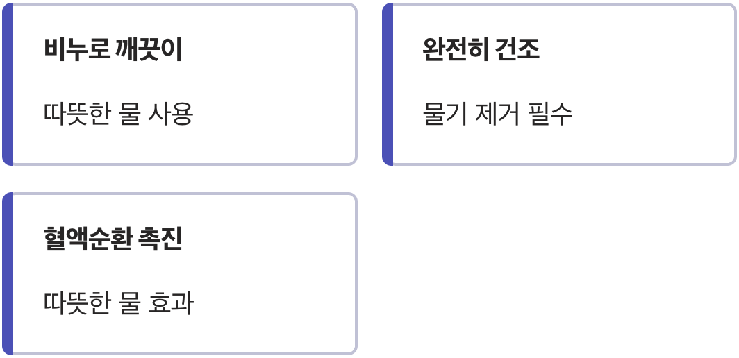 채혈하기 전, 반드시 비누를 이용해 흐르는 따뜻한 물에 손을 깨끗하게 씻어주세요. 따뜻한 물은 혈액순환을 도와 피가 더 잘 나오게 하는 효과도 있습니다. 손을 씻은 뒤에는 물기가 남지 않도록 완전히 말려주는 것이 중요합니다. 물기가 남아있으면 혈액이 묽어져 결과에 영향을 줄 수 있기 때문입니다.