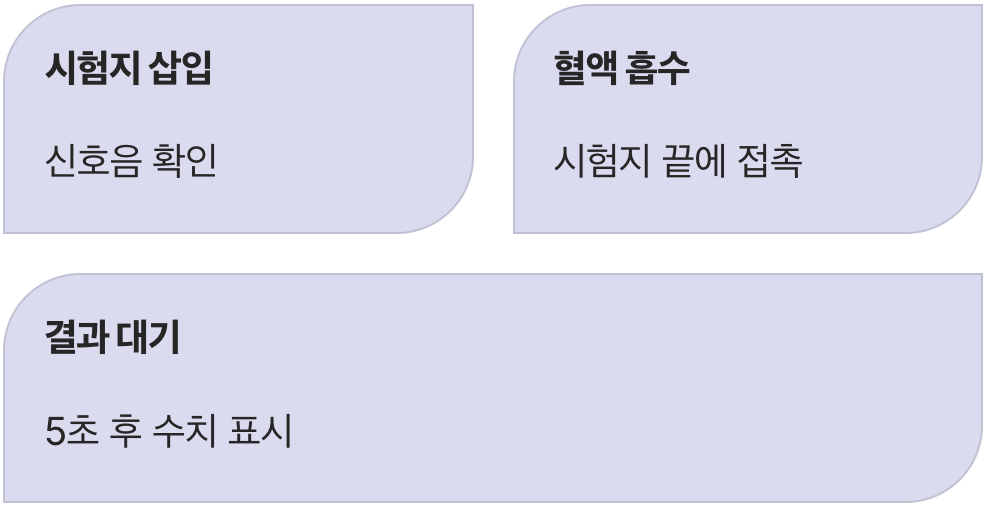 손가락에 맺힌 핏방울에, 시험지의 좁은 끝부분(혈액 흡수 부위)을 살짝 가져다 대세요. 피를 시험지 위에 떨어뜨리는 것이 아니라, 시험지가 스펀지처럼 피를 ‘쪽’하고 빨아들이게 하는 느낌입니다. 시험지에 충분한 양의 혈액이 흡수되면 기계에서 다시 한번 신호음이 울리고, 잠시 후 화면에 당신의 혈당 수치가 나타납니다.