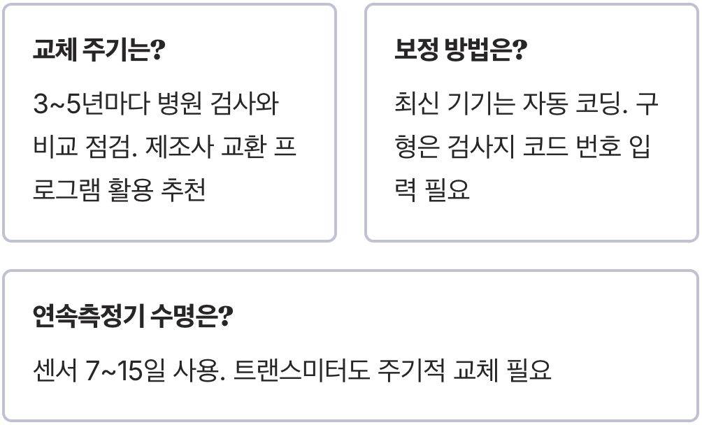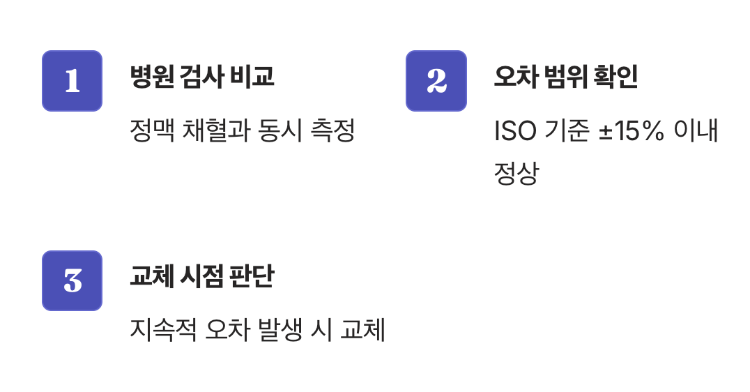 셋째, 화면에 자꾸 에러 메시지가 뜨거나 혈액을 인식하지 못하는 경우가 잦아질 때도 점검이 필요합니다. 이런 신호들을 무시하고 계속 사용한다면, 잘못된 측정값을 바탕으로 잘못된 판단을 내릴 위험이 커집니다. 내 몸이 보내는 신호와 기계가 보여주는 숫자가 계속 어긋난다면, 기기의 신뢰도를 확인해 볼 때가 되었다는 뜻입니다.