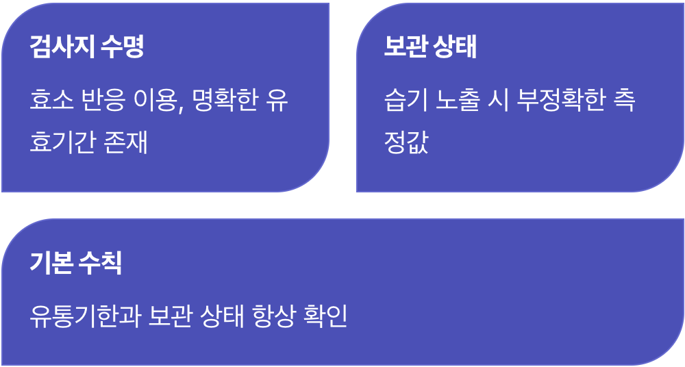 사실 측정 기기 자체의 노후화보다 혈당 측정값에 더 큰 영향을 미치는 주범이 따로 있습니다. 바로 매일 사용하는 ‘혈당 검사지(시험지)’입니다. 혈당계는 반영구적일지 몰라도, 검사지는 효소 반응을 이용하기 때문에 명확한 유통기한이 존재합니다.