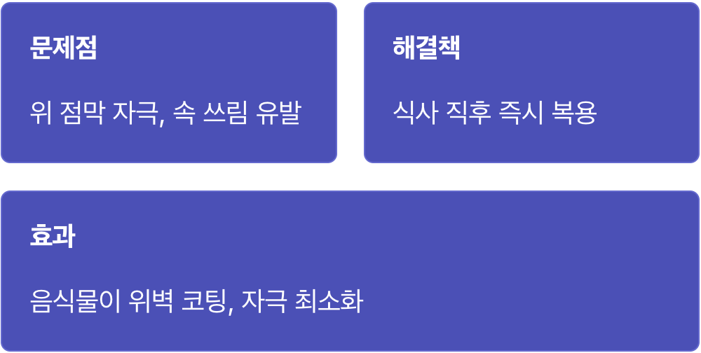 위장을 보호하는 가장 확실한 방법은 위 안에 음식이 남아있을 때 약을 넣는 것입니다. 식사가 끝나고 30분을 기다릴 필요 없이, 숟가락을 놓자마자 바로 약을 드세요. 음식물이 위벽을 코팅해 주는 역할을 해서 약이 주는 자극을 최소화할 수 있습니다. 위가 튼튼해야 약도 꾸준히 먹을 수 있다는 사실을 잊지 마세요.