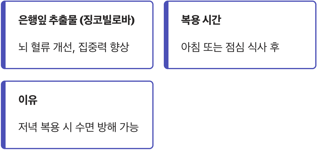 반면 은행잎 추출물(징코빌로바)처럼 뇌 혈류를 개선하고 집중력을 높여주는 성분도 있습니다. 이런 종류는 섭취 후 머리가 맑아지고 에너지가 생기는 효과가 있어서, 예민한 분들은 저녁에 드시면 잠이 잘 안 올 수도 있습니다. 밤에 눈이 말똥말똥해져서 뒤척인 경험이 있다면 시간을 바꿔야 합니다.