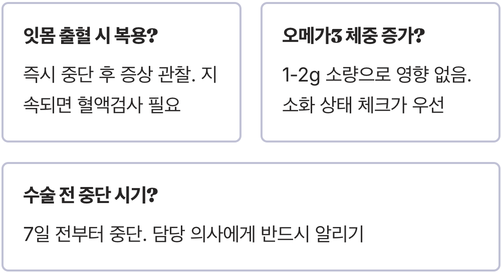 이런 증상이 나타난다면 즉시 복용을 멈추거나 용량을 줄여야 합니다. 특히 치과 치료나 내시경, 수술 같은 중요한 일정을 앞두고 있다면 더욱 조심해야 합니다. 수술 도중 피가 멈추지 않아 위험할 수 있기 때문입니다. 가장 안전한 해결책은 병원에 가기 최소 5일에서 7일 전에는 무조건 약을 끊는 것입니다. 의사 선생님께 내가 먹고 있는 영양제 목록을 반드시 보여드리고 상담받는 것이 나를 지키는 길입니다.