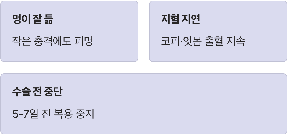 A. 보통 수술이나 시술(내시경, 발치 등) 7일 전부터는 복용을 중단하는 것이 원칙입니다. 약 성분이 체내에서 완전히 빠져나가고 지혈 기능이 정상으로 돌아오는 데 시간이 걸리기 때문입니다. 반드시 담당 의사 선생님께 복용 사실을 알리고 정확한 중단 시점을 안내받으셔야 합니다.