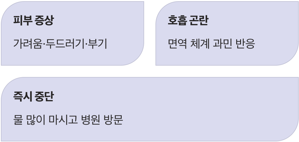 이때는 물을 많이 마셔서 성분을 소변으로 빨리 배출시키는 것이 응급처치가 될 수 있습니다. 그리고 성분표를 꼼꼼히 확인해 보세요. 아스피린 알레르기가 있는 분들은 살리실산이 포함된 제품을 피해야 하고, 해산물 알레르기가 있다면 크릴오일 같은 제품은 독이 될 수 있습니다. 증상이 심하면 바로 병원에 가서 항히스타민제 처방을 받아야 합니다.