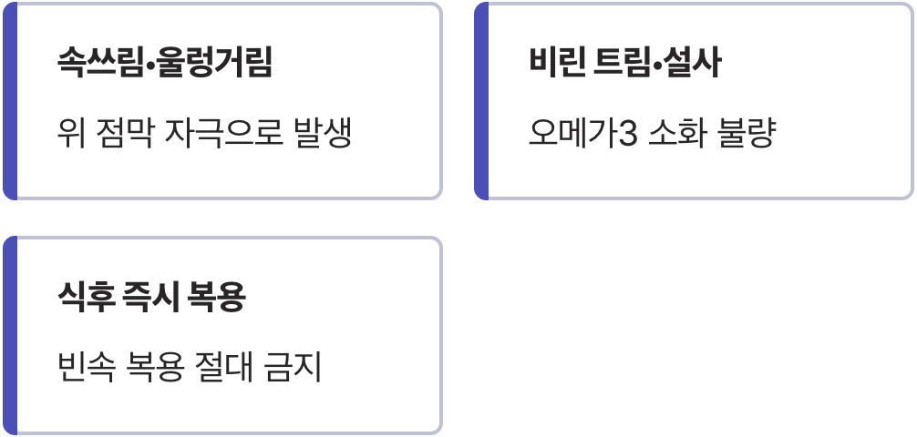 이 문제를 해결하기 위해서는 절대 빈속에 약을 드시지 않는 것이 중요합니다. 위장에 음식물이 들어가서 위벽을 코팅해 주었을 때 약을 넣어야 자극이 덜합니다. 식사가 끝나자마자 물과 함께 바로 드세요. 만약 식후에 먹어도 계속 속이 쓰리다면, 장에서 녹는 '장용성' 제품으로 바꾸거나 전문가와 상의해서 성분을 교체하는 것이 현명한 방법입니다.