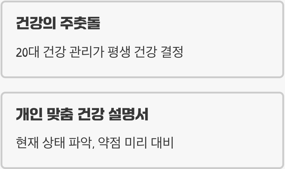 20대는 건강에 대한 자신감이 가장 높은 시기이지만, 동시에 불규칙한 식습관, 잦은 음주, 스트레스, 운동 부족 등 건강을 해치는 습관이 본격적으로 자리 잡는 매우 중요한 시기이기도 합니다. 이때의 건강 관리가 평생 건강의 '주춧돌'을 놓는 것과 같습니다.