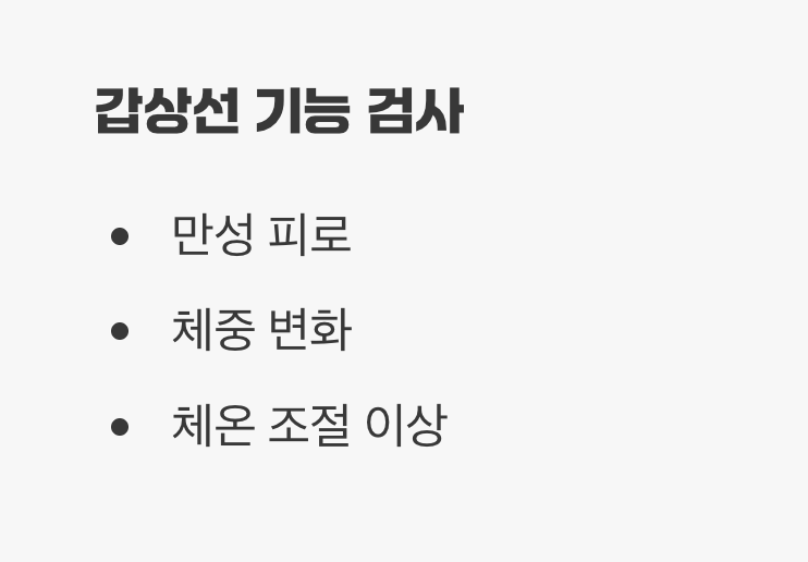 간단한 혈액 검사만으로 갑상선 호르몬(TSH, T4) 수치를 확인할 수 있으며, 이를 통해 갑상선 기능 항진증이나 저하증을 조기에 발견할 수 있습니다. 방치하면 일상생활에 큰 영향을 줄 수 있지만, 조기에 발견하면 약물 치료로 충분히 조절이 가능하므로 꼭 챙겨야 할 검사 항목입니다.