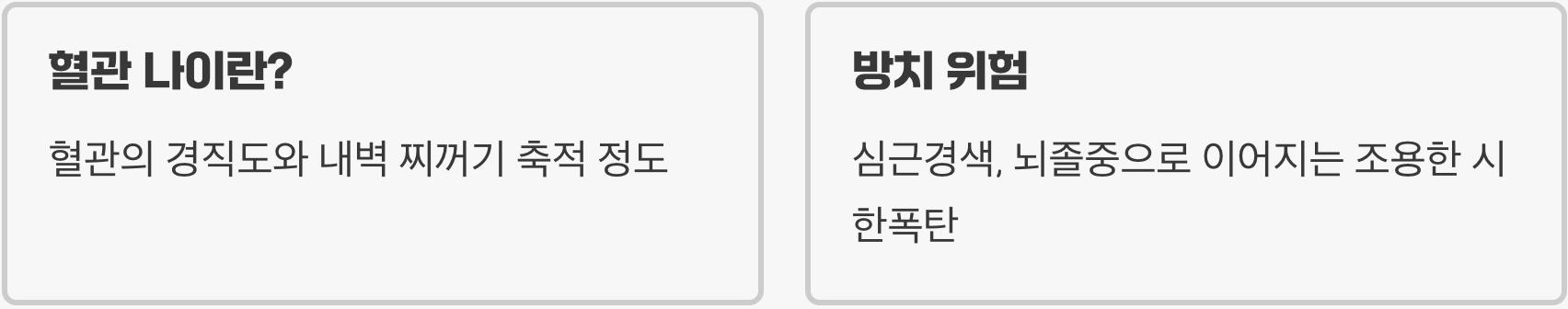 혈관 노화는 단순히 피로감이나 손발 저림에서 그치지 않습니다. 방치할 경우, 혈액의 흐름을 막아 심근경색이나 뇌졸중 같은 치명적인 질환으로 이어지는 '조용한 시한폭탄'이 될 수 있습니다. 따라서 본격적인 노화가 시작되기 전인 30대부터 핏줄의 건강 상태를 관리하는 것이, 100세 시대의 건강을 좌우하는 가장 중요한 첫걸음입니다.
