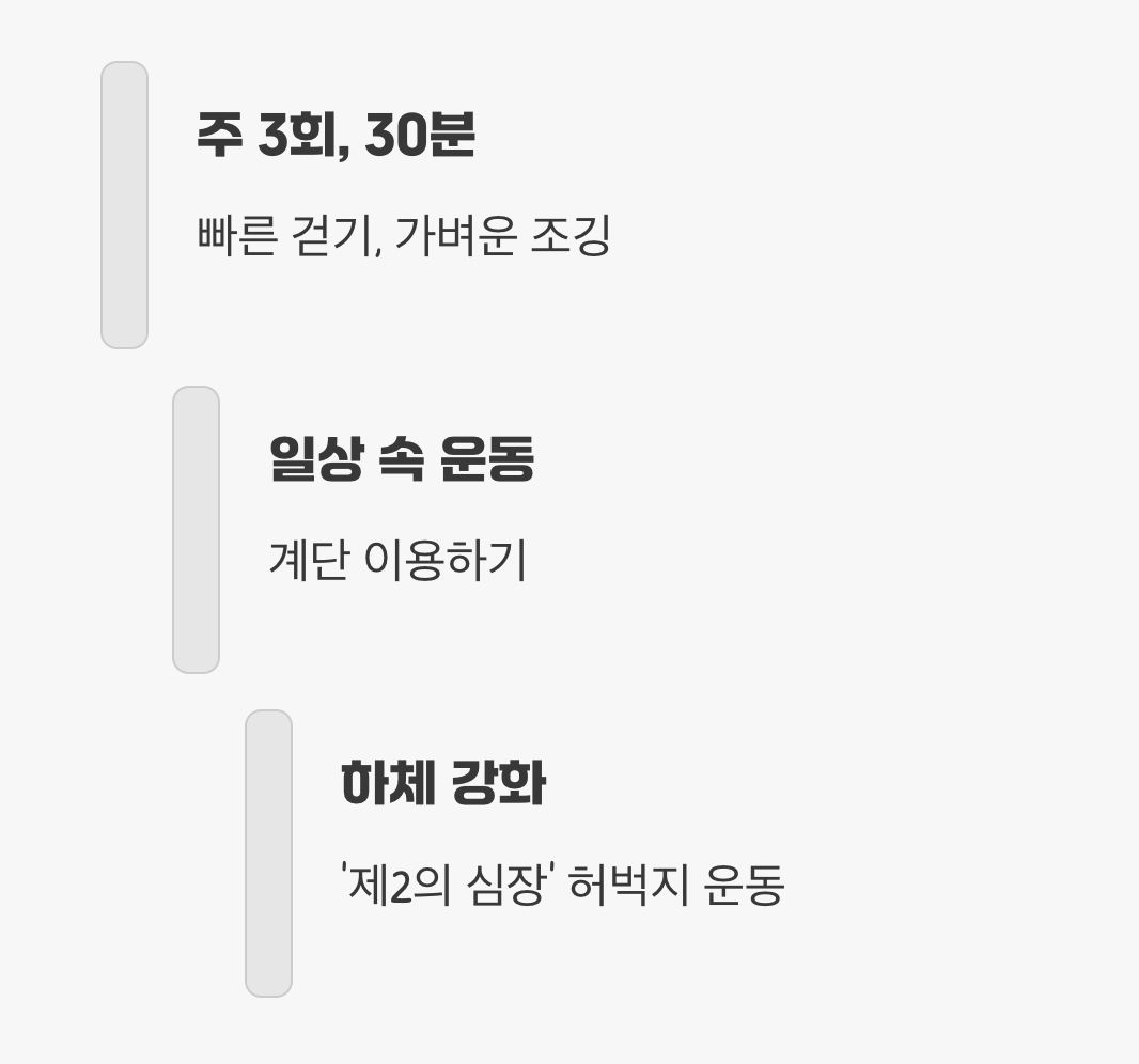 일주일에 3회 이상, 한 번에 30분씩 빠르게 걷기나 가벼운 조깅을 시작해 보세요. 시간이 없다면 엘리베이터 대신 계단을 이용하는 것만으로도 훌륭한 운동이 됩니다. 특히 허벅지는 '제2의 심장'이라 불릴 만큼 혈액 순환에 중요한 역할을 하므로, 스쿼트 같은 하체 운동을 병행하면 혈관 나이를 되돌리는 데 가속도를 붙일 수 있습니다.