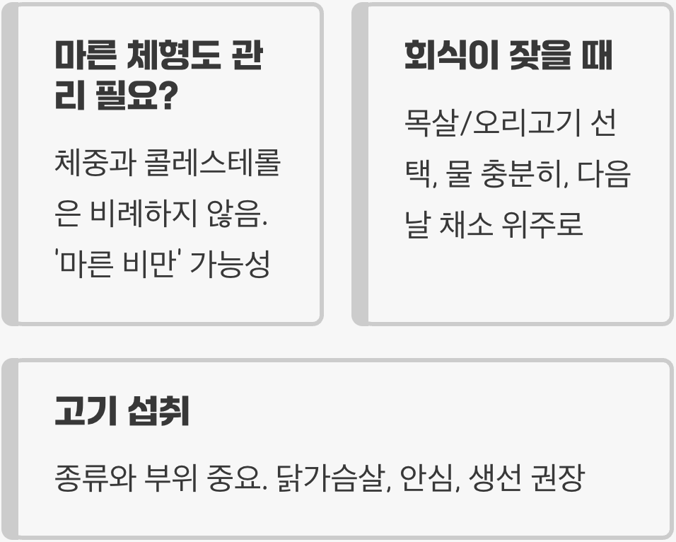 A. 아닙니다. 중요한 것은 고기의 종류와 부위입니다. 기름기가 많은 붉은 고기나 가공육 섭취는 줄이는 것이 좋지만, 지방이 적은 닭가슴살이나 소고기 안심, 등 푸른 생선 등 양질의 단백질은 건강에 필수적입니다. 조리법 또한 튀기거나 볶는 것보다 찌거나 굽는 방식을 선택하는 것이 현명합니다.