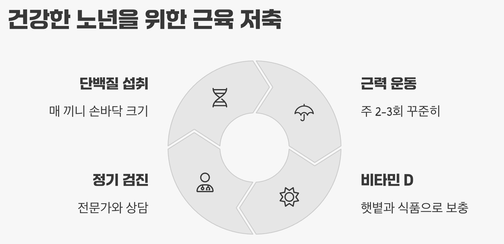단백질 섭취 저하, 운동 부족, 노화 등이 50대 이후 근감소증의 주요 원인으로, 꾸준한 근력 운동과 영양 관리가 필수라고 안내합니다. - 건강은 근력에 있다 - 국민건강보험공단