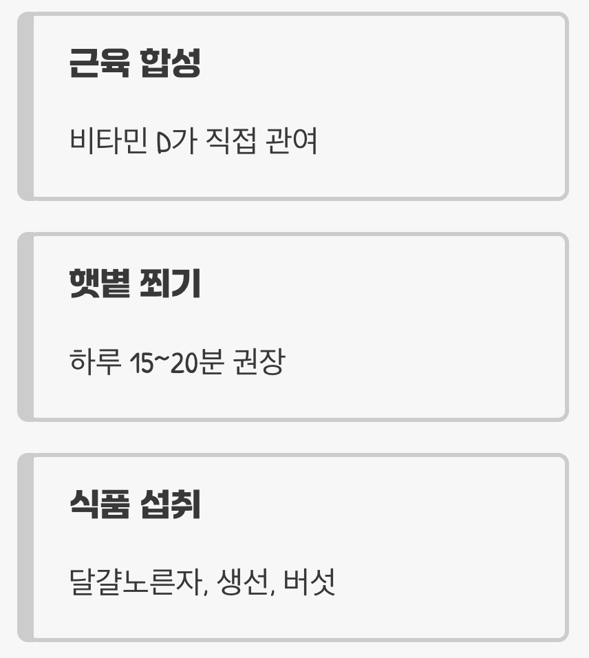근육 건강을 이야기할 때, 빼놓을 수 없는 숨은 조력자가 바로 ‘비타민 D’입니다. 비타민 D는 칼슘 흡수를 도와 뼈를 튼튼하게 할 뿐만 아니라, 근육의 합성 과정과 근력 유지에도 직접적으로 관여하는 것으로 알려져 있습니다.