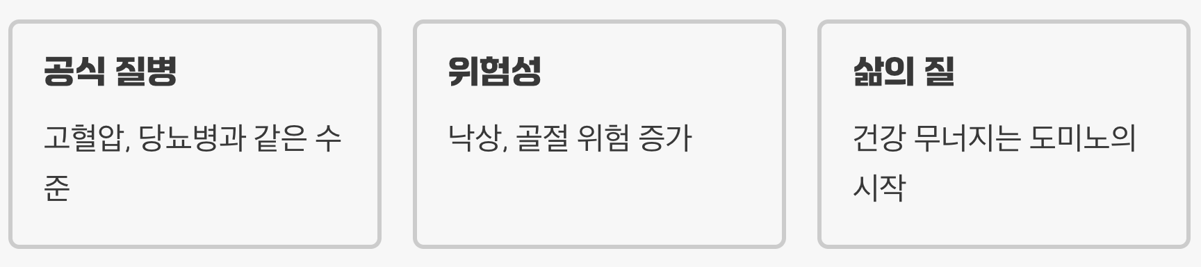 나이가 들면서 근육이 자연스럽게 줄어드는 것은 당연한 노화 과정입니다. 하지만 그 감소 속도가 비정상적으로 빨라져, 일상생활에 지장을 줄 정도로 근력과 신체 기능이 떨어지는 상태를 바로 ‘근감소증(Sarcopenia)’이라고 합니다. 최근에는 근감소증이 고혈압, 당뇨병과 마찬가지로 공식적인 ‘질병’으로 인정될 만큼, 그 위험성이 중요하게 다뤄지고 있습니다.