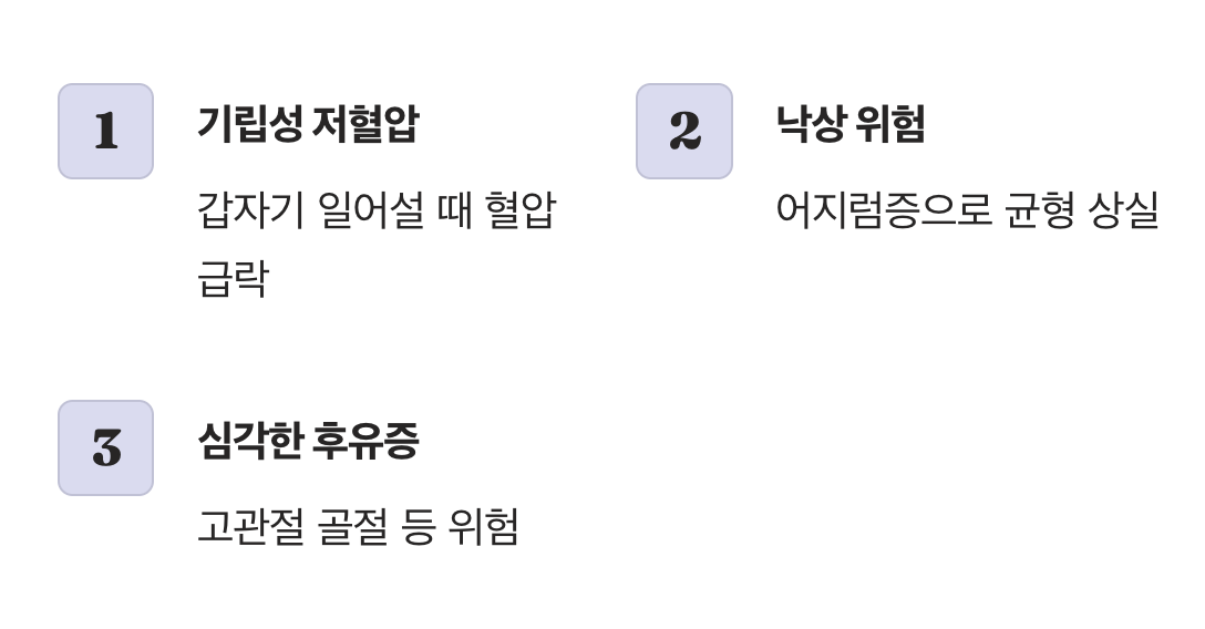 60대 이후의 저혈압에서 가장 경계해야 할 것은 바로 ‘기립성 저혈압’으로 인한 ‘낙상 사고’입니다. 기립성 저혈압이란, 누워있거나 앉아있다가 갑자기 일어설 때 혈압이 급격히 떨어지면서 뇌로 가는 혈액이 일시적으로 부족해져 심한 어지럼증이나 현기증을 느끼는 상태를 말합니다.