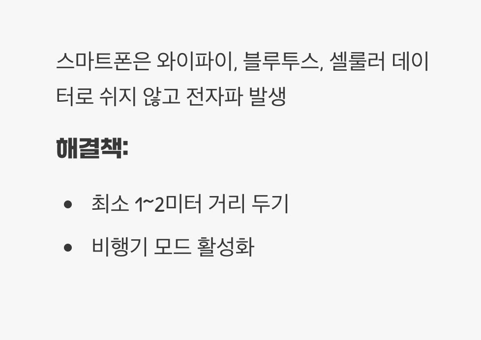 전자파에 장기간 노출되면 호르몬, 면역세포 변화로 아이·성인 모두 두통, 수면 장애, 기억력 저하 등이 나타날 수 있어, 실내 전자기기 최소화 및 일정 거리 유지가 중요하다고 강조합니다. - 내 피곤의 이유가 전자파 때문? 전자파 디톡스로 꿀잠 자기 (worldhome.co.kr)