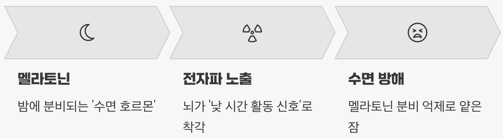 전자기기에서 나오는 전자파와 빛이 수면 패턴을 방해하고 깊은 잠에 들지 못하게 하니, 잠자리 1시간 전에는 기기 사용을 중단하고 침실에서는 반드시 1~2m 떨어뜨려 두는 등 실질적 차단 습관을 제안합니다. - 스마트폰 전자파가 아이에게 미치는 영향 (대한소아청소년과의사회)