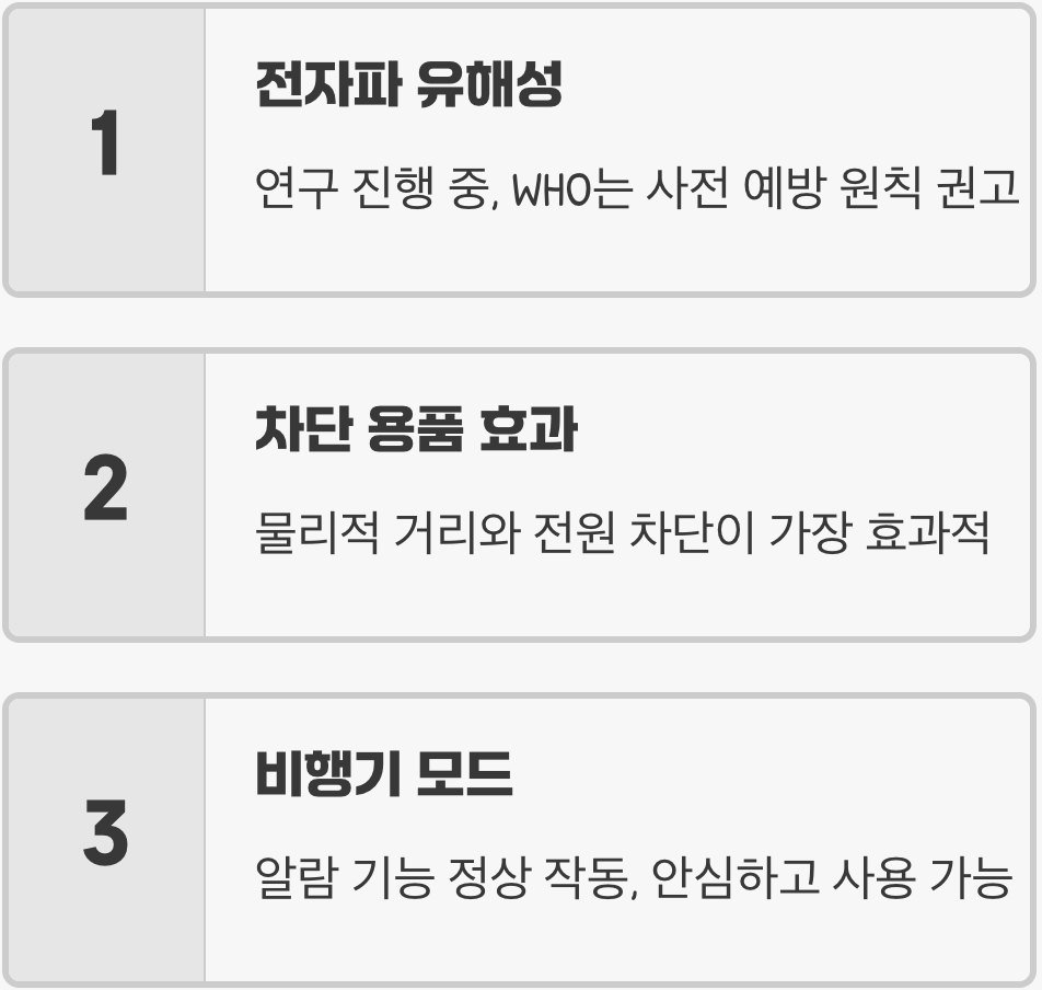 가장 효과적이고 즉각적인 해결 방법은 잠자는 동안 스마트폰과 '물리적 거리'를 두는 것입니다. 전자파의 강도는 거리의 제곱에 반비례하여 급격히 약해지기 때문에, 최소 1~2미터 이상 떨어진 곳에 두는 것만으로도 그 영향을 크게 줄일 수 있습니다. 이것이 어렵다면, 최소한 '비행기 모드'로 전환하여 모든 통신 신호를 차단하는 습관을 들이는 것이 좋습니다.